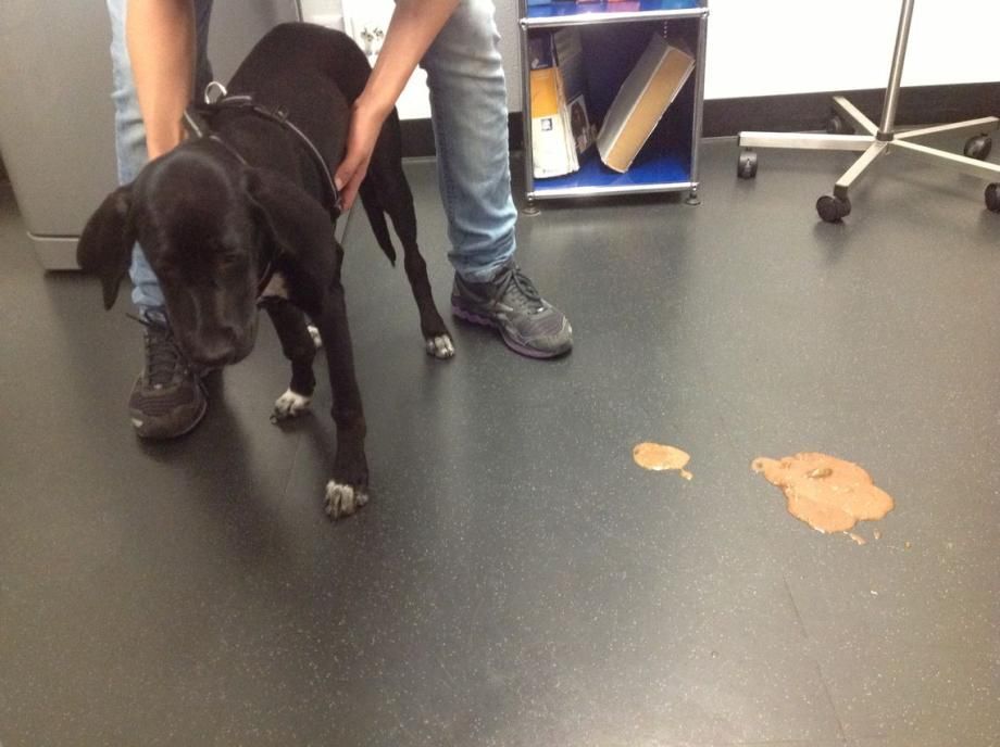 Nora erhält eine Injektion mit einer sehr geringen Menge eines Medikamentes, welches Brechreiz bewirkt. Schon kurze Zeit später beginnt sie zu erbrechen - schlussendlich kommt eine ganze Menge noch unverdauter Schokolade samt Aluverpackung ans Tageslicht. Nora wird daraufhin wieder nach Hause entlassen und zeigt ausser kurzfristig etwas fettigem Kot keinerlei Probleme.