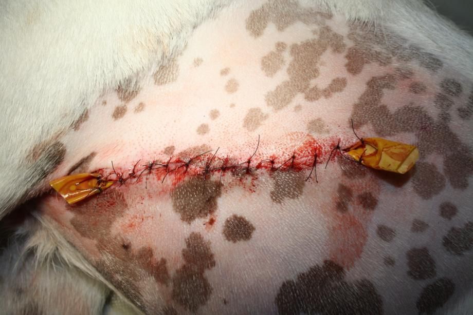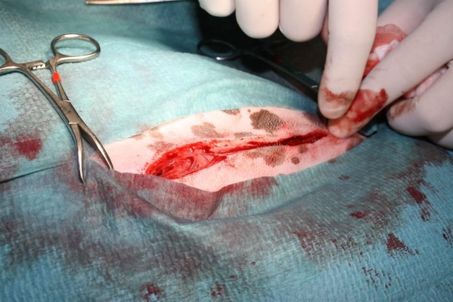 Unter Vollnarkose wird der gesamte durch den Fremdkörper gebildete Unterhaut-Tunnel aufgeschnitten und nach weiteren feinen Holzstückchen abgesucht - glücklicherweise finden sich aber keine grösseren Holzsplitter mehr in der Wunde. Danach wird die Wunde gespült, mit einer Drainage versehen und genäht. Der Hund erhält ein Breitspektrum-Antibiotikum und ein Schmerzmittel.