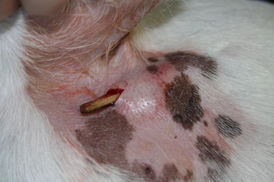 So unwahrscheinlich es zu Beginn erschien, wurde Gina offensichtlich derart unglücklich von einem Splitter des ins Velorad geratenen Stöckchens getroffen, dass dieser zwischen Haut und Brustwand komplett in die Unterhaut implantiert worden war. Sie hatte allerdings Glück im Unglück, dass der Splitter die Brustwand nicht perforierte und in die Brusthöhle gelangte - in diesem Fall wäre unmittelbare Lebensgefahr bestanden und eine chirurgische Sanierung mit sehr viel grösserem Aufwand und Risiko vonnöten gewesen.
