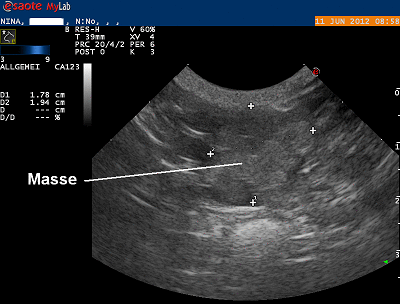 Die Bauchhöhle wird mittels Ultraschall genauer untersucht. Der Knoten erweist sich als unregelmässig begrenzt und von homogener Echotextur. Es ist nicht mit Sicherheit zu klären, ob es sich um einen vergrösserten Lymphknoten oder möglicherweise eine Masse in einer Darmwand handelt. Mit einer feinen Kanüle wird eine Probe zur zytologischen Untersuchung entnommen. Das Pathologielabor diagnostiziert in der Zellprobe einen bösartigen Tumor, welcher aber nicht genauer definiert werden kann.
