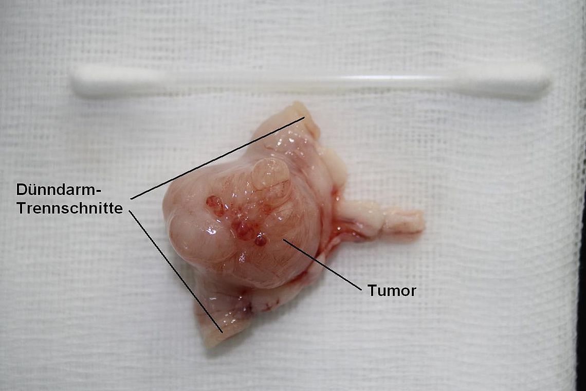 Unter Narkose wird die Bauchhöhle eröffnet. Der ertastete Knoten entpuppt sich als Masse, welche in der Wand des Dünndarmes integriert ist. Der Knoten wird mitsamt etwa 5 cm Darm entfernt und die beiden Dünndarmenden wieder miteinander vernäht. Ebenfalls vernäht wird die entstandene Lücke im Gekröse. Die Naht wird zur verbesserten Wundheilung mit dem grossen Netz, einem vorhangartigen, feinen Gewebe in der Bauchhöhle, bedeckt. Die Bauchwand wird routinemässig verschlossen. Auf eine Biopsieentnahme am leicht vergrösserten Lymphknoten wird verzichtet.