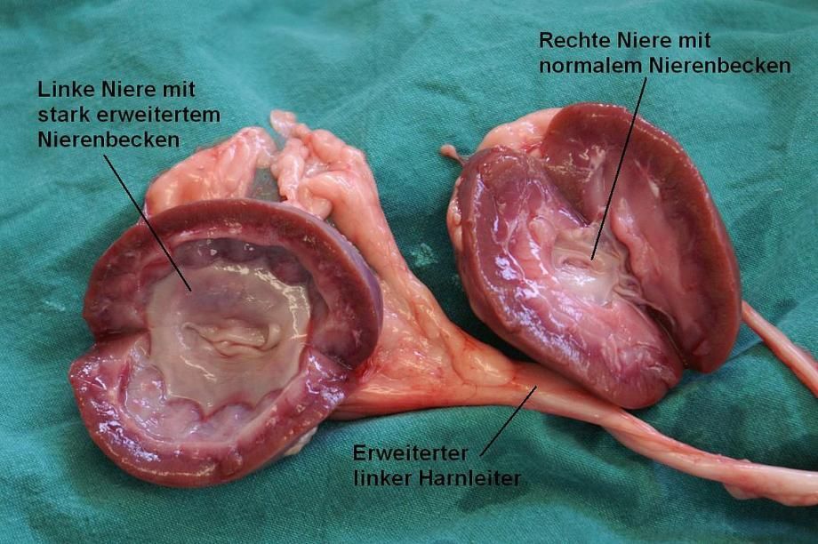 Die linke Niere ist stark verändert: Offensichtlich hat im missgebildeten Harnleiter ein übermässiger Druck geherrscht, welcher nicht nur den Harnleiter selbst zu einem unnatürlichen Durchmesser und einer geschlängelten Form ausgedehnt hat, sondern auch zu einer starken Erweiterung des linken Nierenbeckens geführt hat. Das funktionelle Nierengewebe ist dadurch stark komprimiert worden. Der rechte Harnleiter und die rechte Niere erscheinen relativ normal. Beide Ureteren münden aber wie zuvor festgestellt nicht an den üblichen Orten in die Harnblase: Sie verlaufen als Tunnel in der Blasenwand und münden erst weit im Beckenraum. Der rechte Harnleiter weist eine kleine Öffnung in die Blase auf, durch welche etwas Urin (wie eigentlich normalerweise) direkt in die Blase gelangen kann.