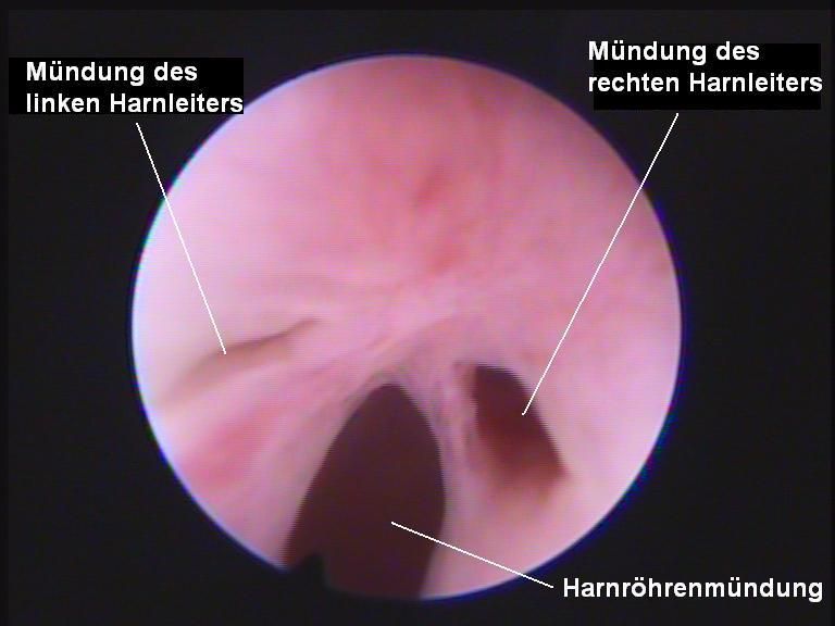 In Narkose werden Vagina, Harnröhre und Blase mit einem Endoskop untersucht. Dabei zeigt sich, dass beide Harnleiter unmittelbar neben der normalen Harnröhrenöffnung direkt in die Scheide münden. Die rechte Harnleiteröffnung steht weit offen, die linke ist eher klein. Optisch kann so der röntgenologische Befund von ektopischen Ureteren bestätigt werden.
