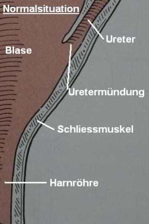 Normalerweise münden bei Hunden beide Harnleiter im Dach der Harnblase, nahe des Ursprungs der Harnröhre, in die Blase. Der sich in der Mündung der Harnröhre befindliche Blasenschliessmuskel ermöglicht so eine kontinuierliche Befüllung der Blase mit Urin, ohne dass Harn austritt. Periodisch wird die Blase dann beim Harnabsatz entleert - der Hund ist sogenannt "kontinent" (siehe Schema 1).