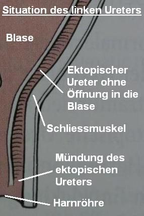Bei "Gipsy" münden beide Harnleiter nicht in die Blase selbst, sondern in die Vagina. Der rechte Harnleiter hat eine zusätzliche kleine Öffnung in die Blase, durch die Urin (wie eigentlich normal) die Blase befüllen kann (siehe Schema 2). Der Urin, welcher durch die Harnleiter aus den Nieren abgeführt wird, füllt dadurch teilweise die Blase, gelangt aber unter Umgehung des Blasenschliessmuskels zu einem grossen Teil auch direkt in die Scheide - der Hund verliert konstant Urin, er ist "inkontinent".