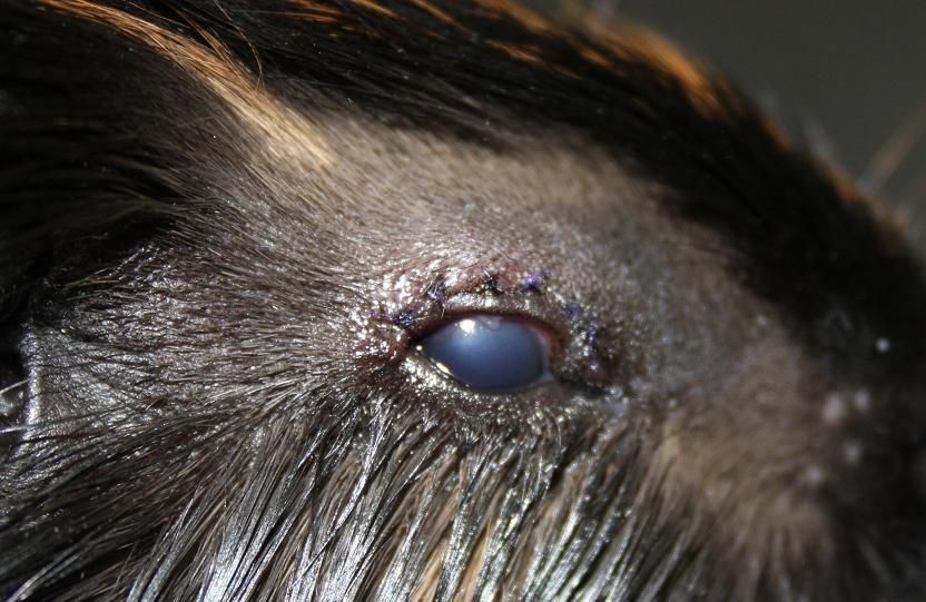 Das Meerschweinchen-Baby wird vorsichtig narkotisiert und während der Operation fortwährend gewärmt. Vom Oberlid wird ein kleines, halbmondförmiges Stück Haut entfernt, wodurch das Oberlid "geliftet" wird und nicht mehr mit der Aussenseite auf der Hornhaut reibt. Zum Nähen der Wunde wird ein Faden mit der Stärke 6-0 USP (0.07 mm Dicke; derselbe Durchmesser wie ein menschliches Haar) verwendet. Die Fadenenden werden stark gekürzt, wodurch die Nähte nicht stören. Sie werden nicht entfernt (da dazu eine weitere Narkose nötig wäre) und werden nach einiger Zeit von selbst ausfallen. Das Auge wird mit Tropfen und einer hornhautregenerierenden Salbe behandelt.