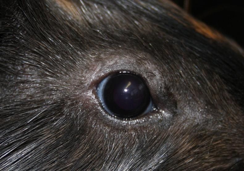 Mit der Lupenbrille ist ersichtlich, dass das Oberlid des rechten Auges stark eingerollt ist und dadurch die Haare des Lids auf der Hornhaut reiben. Aufgrund dieses Traumas hat sich ein Hornhautgeschwür entwickelt, und die Hornhaut hat durch eintretende Tränenflüssigkeit ein Ödem entwickelt und ist milchig-weiss. Es handelt sich bei der Veränderung offensichtlich um eine Missbildung - ein sogenanntes Entropium.