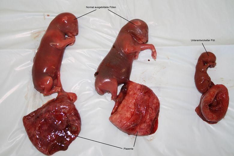 Ein Ultraschall der Bauchhöhle zeigt leider, dass beide Föten tot sind: Die Herzen sind einwandfrei darstellbar und schlagen nicht, auch ein Dopplerultraschall zeigt keinen Blutfluss in den beiden Körperchen. Hinter dem im linken Gebärmutterhorn liegenden Fötus findet sich ein dritter Föt - dieser ist aber sehr viel kleiner als die beiden anderen; der Schädeldurchmesser beträgt nur ca 10 mm, währenddem derjenige der normal entwickelten Föten ca 22 mm beträgt. Auch dieser unterentwickelte Fötus zeigt keine Lebenszeichen.
