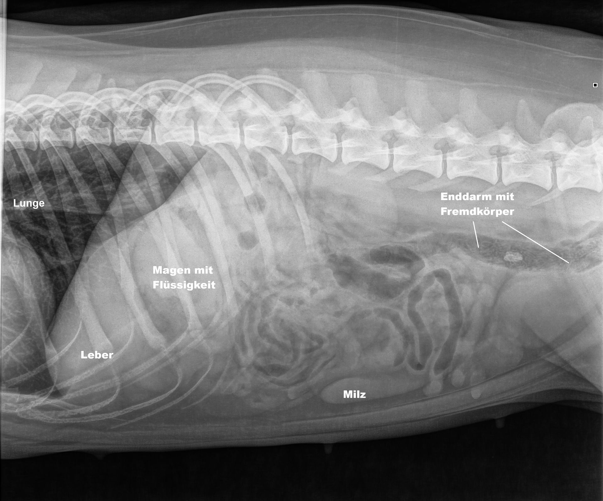 Im Röntgen ist erkennbar, dass der Fremdkörper mit grösster Wahrscheinlichkeit schon den ganzen Dünndarm passiert hat und sich im Dickdarm befindet. Der Magen enthält etwas Flüssigkeit, weshalb radiologisch nicht ausgeschlossen ist, dass sich auch hier noch Teile des Fremdkörpers befinden könnten. Der Dünndarm zeigt zum Glück keine Anzeichen eines Darmverschlusses.