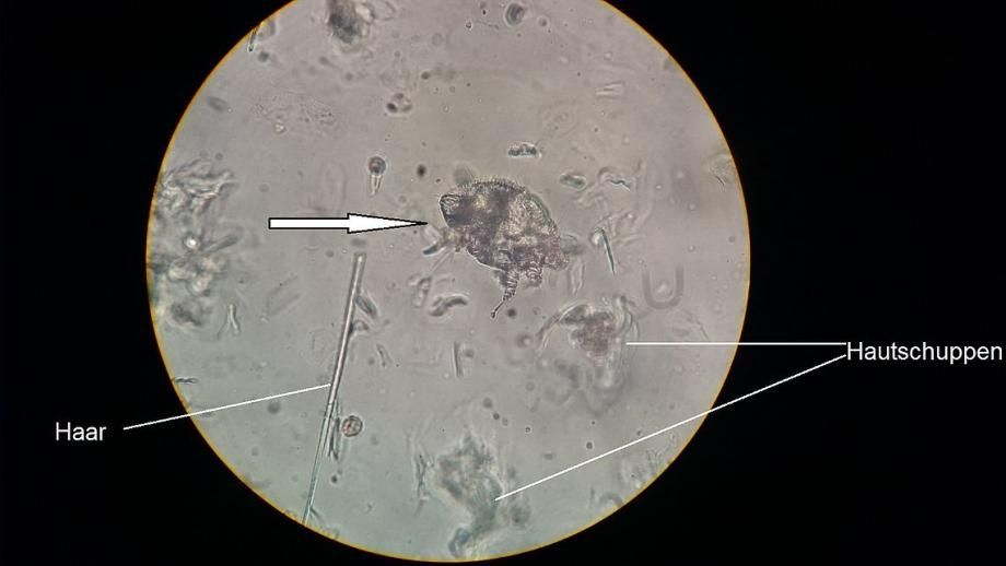 Die Befunden sprechen sehr stark für den Befall mit Grabmilben (Trixacarus Caviae): Die in der Haut Tunnel grabenden Parasiten verursachen einen starken Juckreiz mit Haarausfall. Zur definitiven Diagnose wird ein Hautgeschabsel angefertigt: Tatsächlich lässt sich im Mikroskop eine lebende Milbe nachweisen.