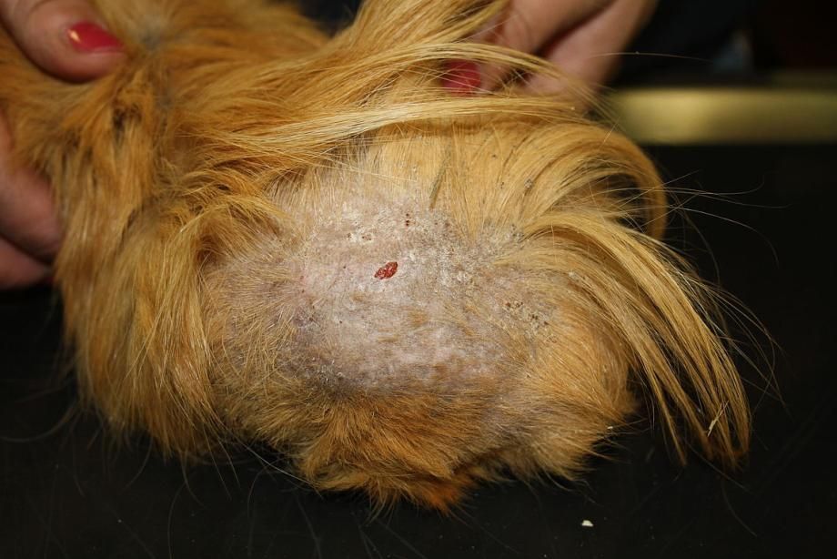 Das Hinterteil und die Flanken des Meerschweinchens sind flächig haarlos und weisen diverse oberflächliche Wunden auf. Die umliegenden Haare lassen sich büschelweise ausziehen, die Haut ist stellenweise bedeckt mit einer borkigen Kruste. Das Tier zeigt einen deutlichen Juckreiz; der restliche Untersuch ist unauffällig. Das zweite mitgebrachte Meerschweinchen zeigt ein deutlich besseres Hautbild; allerdings ist auch hier eine kleine, haarlose, krustige Region zu finden.