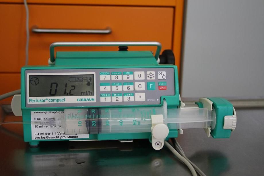 Die Katze wird narkotisiert, eine intravenöse Tropfinfusion zur Stützung des Kreislaufs wird gelegt, und eine uns neu zur Verfügung stehende Schmerztherapie wird eingeleitet: Über eine Spritzenpumpe werden der Katze vor, während und nach der Operation kontinuierlich kleinste Mengen eines morphinähnlichen Schmerz- und Betäubungsmittels zugeführt.
