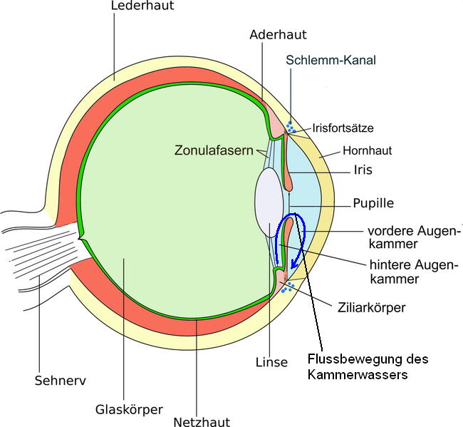Glaukom (oder grüner Star) bezeichnet eine Augenerkrankung, bei der das Auge durch einen erhöhten Innendruck zu Schaden kommt. Normalerweise wird der Druck durch eine balancierte Produktion und Wiederaufnahme von Kammerwasser sehr fein reguliert: Das Kammerwasser wird vom Ziliarkörper (Fachbegriffe: Siehe untenstehende Grafik) in der hinteren Augenkammer gebildet und fliesst durch die Pupille in die vordere Augenkammer, wo sie im Winkel zwischen Iris und Hornhaut wieder aufgenommen und dem Blutkreislauf zugeführt wird. Wird entweder zuviel Kammerwasser produziert oder zuwenig entfernt (beispielsweise weil der Fluss in die vordere Augenkammer durch eine Verklebung der Iris mit der Linse behindert ist), steigt der Augeninnendruck. Als Folge werden die empfindliche Netzhaut und die Hornhaut beschädigt und das Auge kann erblinden. Neben der Erblindung stellt auch die starke Schmerzhaftigkeit eines Glaukoms ein Problem dar.