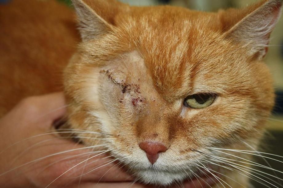 Das rechte Auge ist grotesk verändert: Der Augapfel ist gewaltig vergrössert und dadurch aus der Augenhöhle hervorgetreten; die Katze ist auf diesem Auge blind. Auf der zentralen Hornhaut hat sich ein grosser Hornhautdefekt gebildet. Eine Messung des Augendrucks mittels eines elektronischen Tonometers bestätigt den Verdacht, dass das Auge einen stark erhöhten Innendruck aufweist: Er ist etwa dreimal so hoch wie normal - die Katze leidet an einem sogenannten Glaukom (grünem Star). Durch den erhöhten Druck ist das Auge erblindet und als Komplikation ist ein Hornhautgeschwür entstanden: Die Katze konnte aufgrund des riesigen Augapfels nicht mehr blinzeln, und die Hornhaut ist infolgedessen ausgetrocknet.