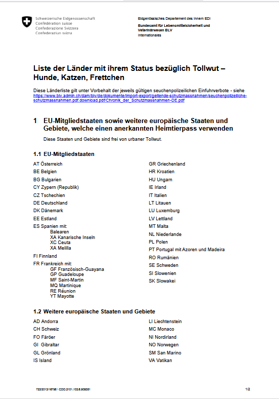 Aufgrund der Tollwutproblematik ist das internationale Reisen mit Hunden, Katzen und Frettchen gesetzlich geregelt. Zum Reisen innerhalb der EU und der Einreise in die EU aus der Schweiz reicht eine gültige Tollwutimpfung, eine Eintragung der Impfung im Heimtierpass sowie die Kennzeichnung des Tiers mittels Mikrochip. Die Tollwutimpfung darf frühestens im Alter von 12 Wochen vorgenommen werden, 3 Wochen später darf das Tier dann reisen. Die Einreise in die Schweiz aus der EU ist gegenwärtig unter gewissen Bedingungen auch ohne Tollwutimpfung möglich, wenn der Welpe jünger als 12 Wochen ist.