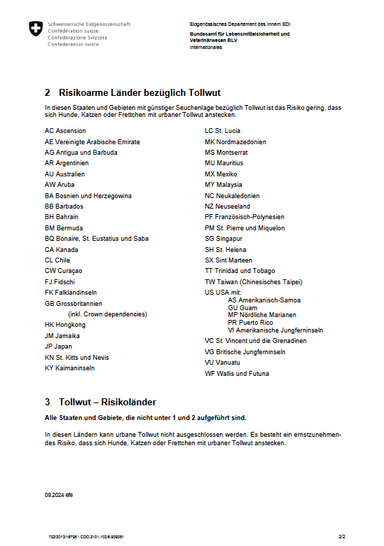 Erfolgt die Einreise aus einem Land, in welchem Tollwut vorkommt, ist das Prozedere komplizierter: Der Hund benötigt einen Heimtierpass, einen Mikrochip sowie eine Tollwutimpfung (frühestens im Alter von 12 Wochen). Anschliessend muss frühestens 30 Tage nach Impfung ein Bluttest zur Bestimmung des Tollwuttiters (Menge der Abwehrstoffe gegen Tollwut im Blut) vorgenommen werden, die Probe muss in einem international anerkannten Referenzlabor analysiert werden. Ist der Titer genügend hoch, schliesst sich eine Warteperiode von 3 Monaten an, anschliessend darf der Hund nach Beantragung einer Einreisebewilligung des Bundesamtes für Veterinärwesen und Einholen einer Veterinärbescheinigung im Herkunftsland in die Schweiz einreisen. Eine Onlinehilfe beim Reisen mit Tieren ist auf der Website des BLV zu finden.