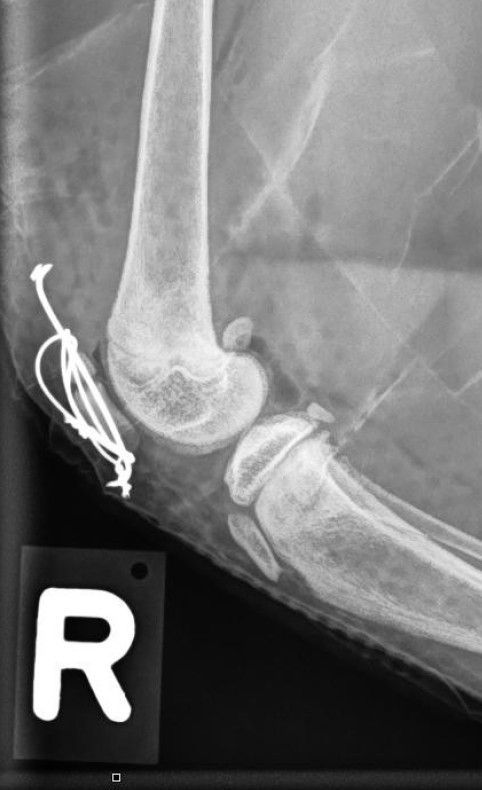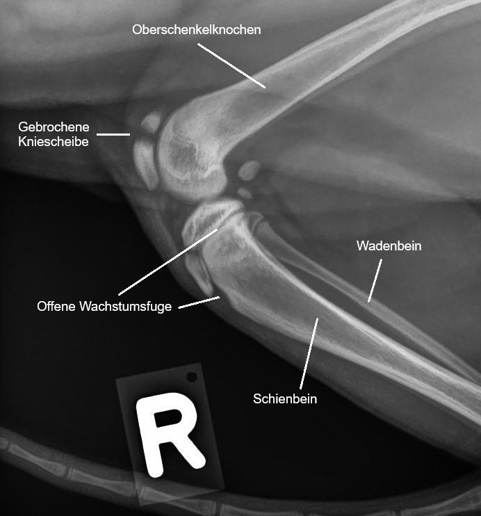 Ein Bruch der Kniescheibe ist hingegen eine sehr ungewöhnliche Verletzung bei Hunden und Katzen; es wird geschätzt, dass sie nur 0.25% aller Knochenbrüche ausmachen. Da durch die Fraktur das Kniegelenk nicht mehr korrekt bewegt werden kann, wird der Bruch chirurgisch versorgt. Das Problem: Auf den Frakturspalt wirken v.A. Zugkräfte ein, welche die Bruchstücke auseinanderziehen und so eine Heilung erschweren. Im Gegensatz dazu wirken z.B. beim Bruch des Unterschenkelknochenschafts auf den Bruchspalt hauptsächlich Druckkräfte ein, welche den Frakturspalt komprimieren und so eine Heilung einfacher machen. Bei einer Kniescheibe wird deshalb mit der sogenannten Zuggurtung ein System aus Nägeln und Drähten verwendet, um diese Zugkräfte zu neutralisieren.