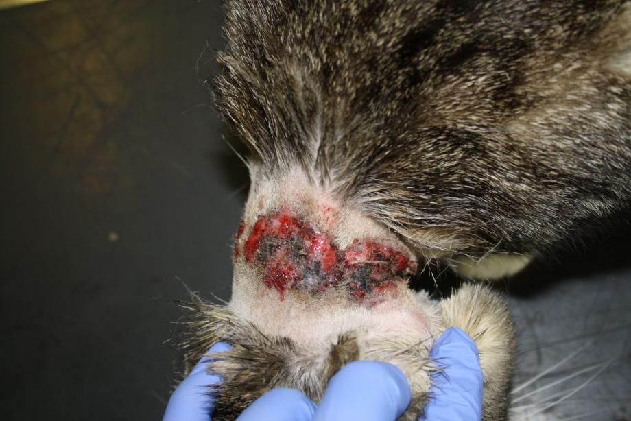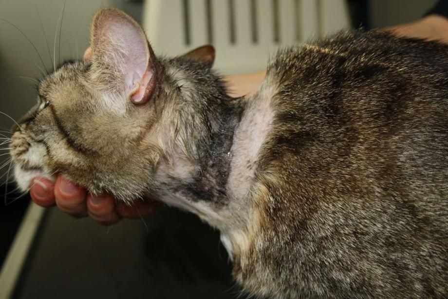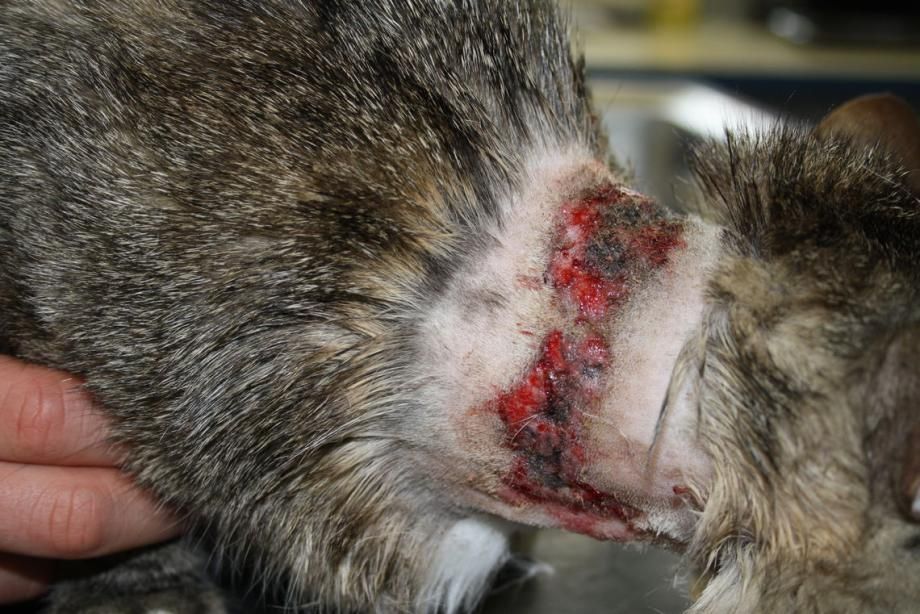 Vorsichtig wird die Wunde gereinigt und von abgestorbener Haut und Krusten befreit. Ein desinfizierendes Wundgel wird aufgetragen und ein Antibiotikum und Schmerzmittel verabreicht. Die Krallen der Hinterpfoten werden gekürzt, um die Traumatisierung der Wunde durch Kratzen zu vermindern. Den Besitzern wird Verbandsmaterial mitgegeben, um bei fortgesetztem Kratzen zum Schutz der Wunde einen Halsverband anzulegen.