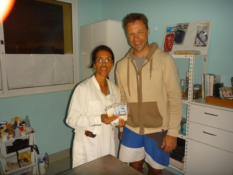 Kurz vor meiner Abreise war mir von Kunden unserer Praxis, welche aufgrund der Fälle "Lyssbach's Vétérinaires sans Frontières" auf meine Reisetätigkeit aufmerksam geworden waren, eine Spende überreicht worden. Gerne übergab ich Fatima den Betrag in der lokalen Währung zur Verwendung bei der Betreuung der Streunertiere auf Sal; die Tierärztin war über den unerwarteten Zustupf aus der Schweiz natürlich hell erfreut.
