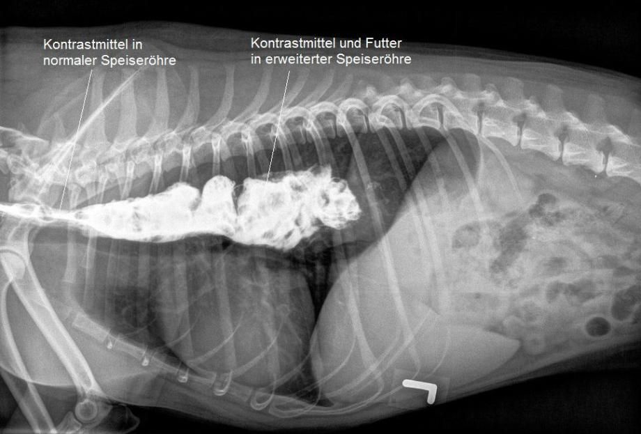 Das Bruströngen ist verdächtig für eine Erweiterung der Speiseröhre in diesem Bereich. Zur weiteren Abklärung erhält Jago nun Futter, welches mit einem Röntgenkontrastmittel vermischt ist. In einer weiteren Röntgenaufnahme wird dann dokumentiert, dass das geschluckte Futter nicht ordnungsgemäss im Magen gelandet ist, sondern in der stark erweiterten Speiseröhre in der Brusthöhle liegen geblieben ist - der Hund leidet unter einem Megaösophagus.