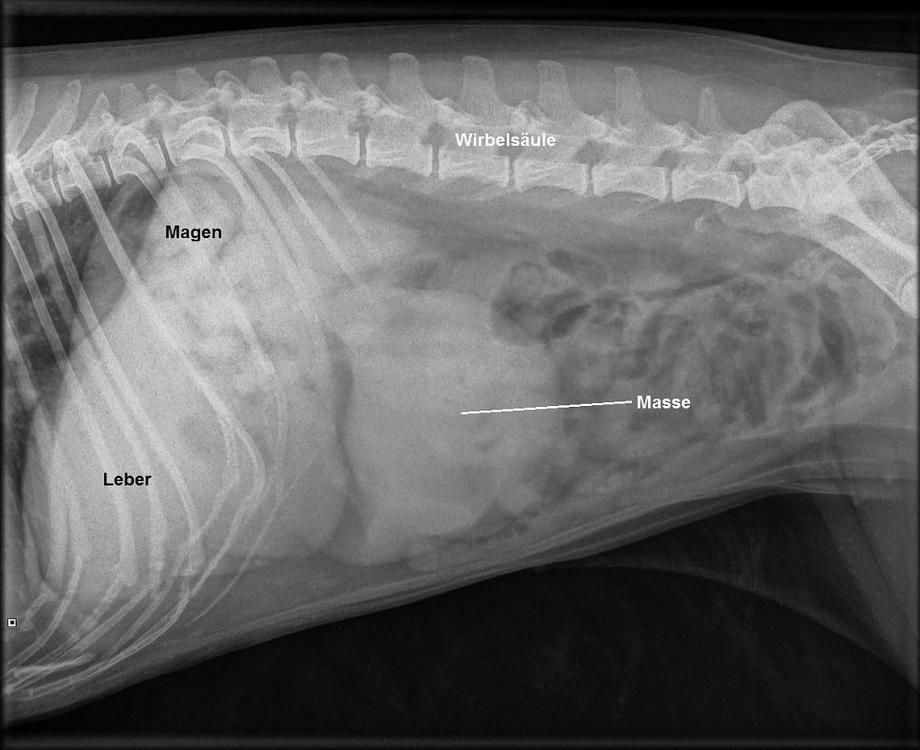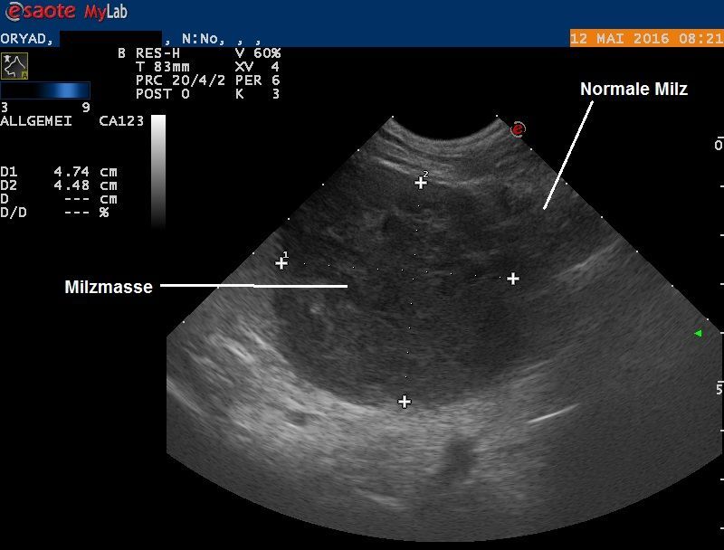 Obwohl nun bekannt ist, dass sich im Bauch des Hundes ein Knoten verbirgt und dieser zielgerichtet abgetastet werden kann, erweist sich die Masse als nicht ertastbar. Im Ultraschall findet sich dann aber ein knapp 5 cm messender, kugeliger Knoten innerhalb der Milz. Der Knoten zeigt eine heterogene (uneinheitliche) Echotextur und enthält auch kleine Hohlräume, welche mit Flüssigkeit gefüllt scheinen. In der Bauchhöhle findet sich aber keine Flüssigkeit, die restlichen Bauchorgane erscheinen unauffällig, und auch ein kurzer Ultraschall des Herzens verläuft unauffällig.
