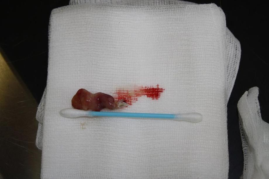 Hierzu können verschiedene Methoden angewendet werden. Aus verschiedenen Gründen wird bei "Oliver" die relativ einfach auszuführende Extraktionsmethode angewendet: Mittels einer Fasszange wird das Gewebe ergriffen und unter stetigem Zug an der Basis abgerissen. Hierbei ist eine geringe Blutung normal, auch kann eine (meist temporäre) Schädigung eines Gesichtsnervs erfolgen.
