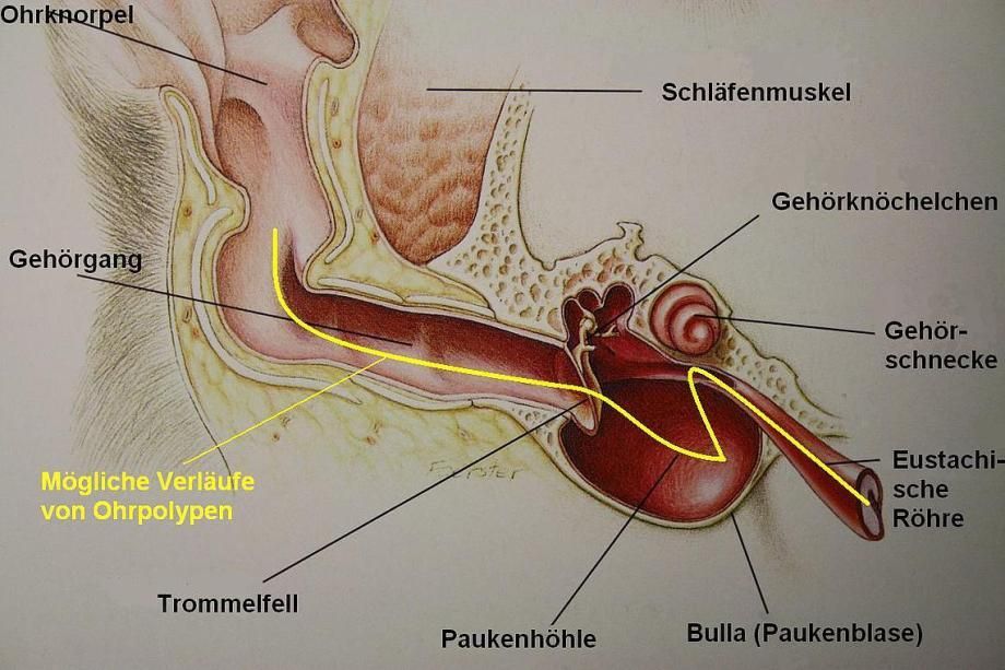 Polypen sind gutartige, meist zusätzlich entzündete Schleimhautwucherungen. Bei Katzen entstehen sie aus unbekannten Gründen vor allem bei jüngeren Tieren mit Vorliebe im Rachenraum, der eustachischen Röhre (der Verbindung von Rachenraum und Mittelohr, welche um den Druckausgleich z.B. im Flugzeug besorgt ist) und dem Mittelohr. Es kann vorkommen, dass ein Polyp im Rachenraum zu wachsen beginnt und über die eustachische Röhre, das Mittelohr und unter Durchbrechen des Trommelfells bis in den äusseren Gehörgang einwächst. Als Folge ist meist eine chronische Entzündung des Gehörganges und/oder des Mittelohrs zu erwarten.