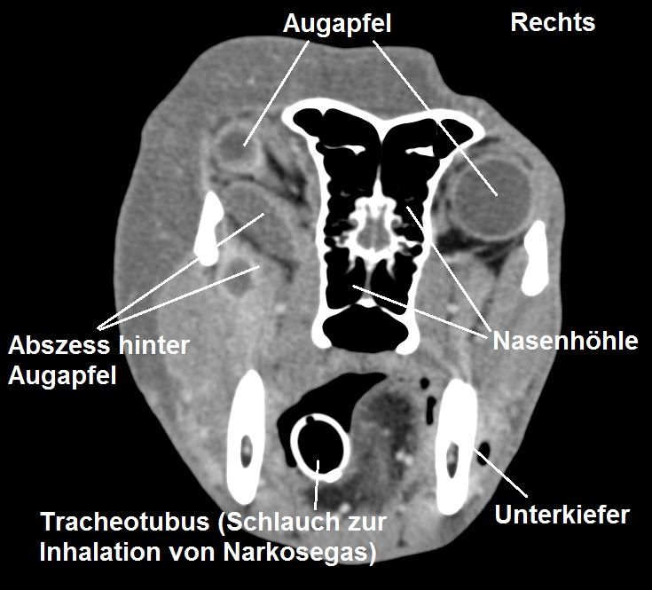 Unter Narkose wird am gleichen Nachmittag von Juci ein Computertomogramm (CT) des Kopfes angefertigt. Das dreidimensionale Röntgenbild zeigt, dass sich im Schädel des Hundes linksseitig ein Abszess gebildet hat, welcher aus mehreren Kammern besteht, die Augenhöhle hinter dem Augapfel durchquert und vom Gaumen bis in die Kaumuskulatur der Kopfoberseite reicht.