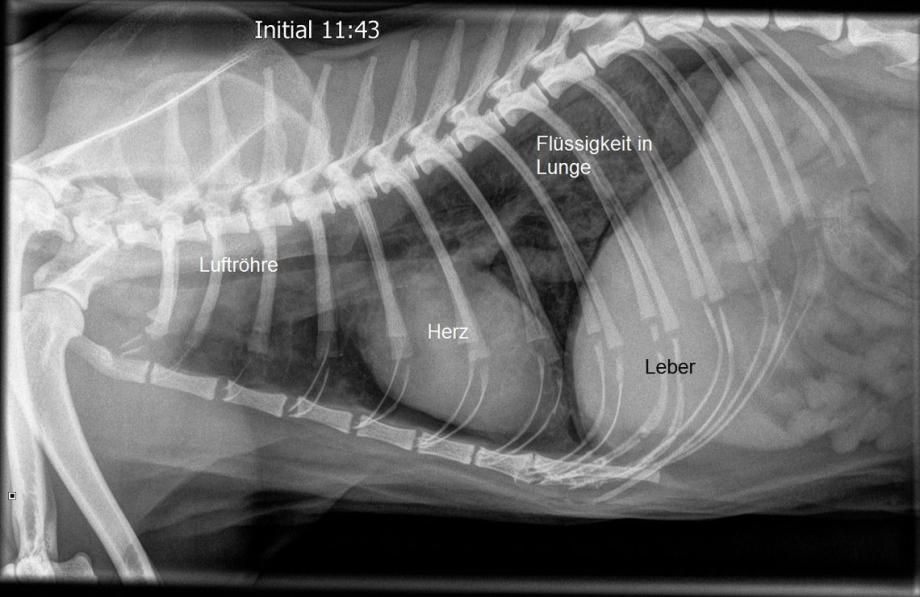 Sofort wird ein Röntgen des Brustkorbs angefertigt - bestürzt müssen wir feststellen, dass sich in den hinteren oberen Lungenarealen von Muffin ein Lungeninfiltrat (Flüssigkeit) gebildet hat, was die Schweratmigkeit erklärt.