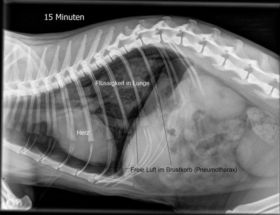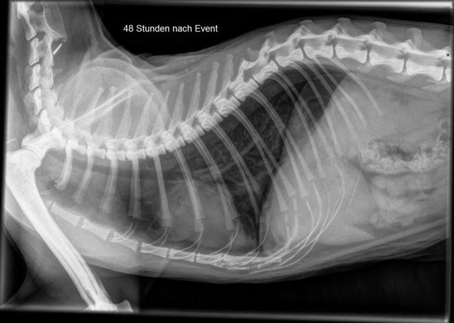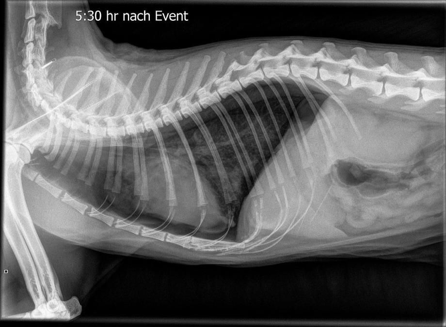 Im Verlauf der nächsten Viertelstunde verbessert sich die Atmung von Muffin leider nicht - im Gegenteil, die Katze atmet noch angestrengter und speichelt stark. In der Zwischenzeit ist der Kater aber schon wieder bei Bewusstsein. Erneut wird ein Lungenröntgen angefertigt - erschreckenderweise zeigt sich nun neben der Flüssigkeitsbildung in der Lunge ein zweites Problem: Muffin zeigt einen Pneumothorax; eine Situation, bei der sich entweder durch ein Riss in der Lunge oder aber einer tiefen Wunde im Brustkorb Luft zwischen der Lunge und dem Brustkorb bildet und so das Lungenvolumen mehr und mehr einschränkt.