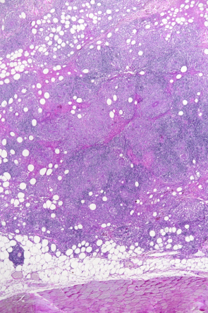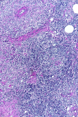 Mikroskopische Aufnahme des Gewebes - geringe Vergrösserung. Mikroskopische Aufnahme des Gewebes - starke Vergrösserung. Bei Aufnahme: Dr. U. Hetzel den dunklen Punkten handelt es sich um Entzündungszellen. Aufnahme: Dr. U. Hetzel