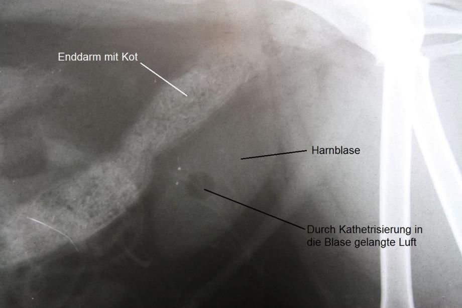 Unter Ultraschallkontrolle wird steriler Urin direkt aus der Blase entnommen und in einem externen Labor bakteriologisch untersucht - es werden aber keine Erreger festgestellt. Hingegen zeigt sich im Ultraschall, dass die Blase Fremdkörper enthält, welche einen Schallschatten werfen. Im Röntgen bestätigt sich die Vermutung, dass die Blase der Katze eine grosse Zahl sehr kleiner Steine enthält, welche röntgendicht ("weiss") erscheinen.